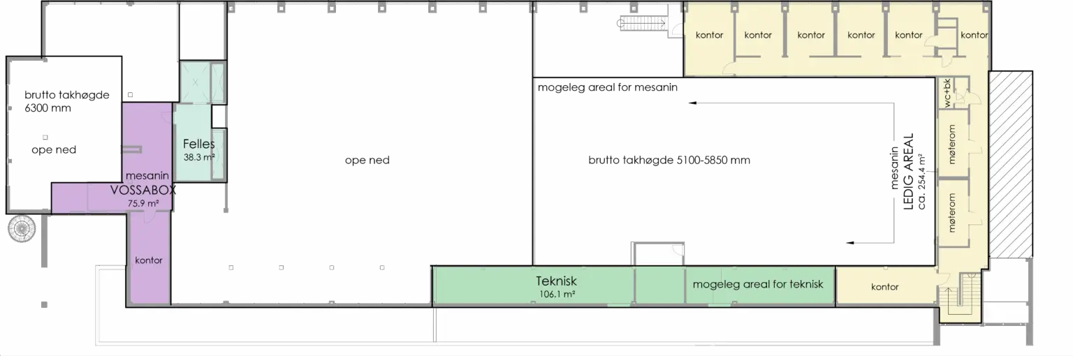 Fleksible kontorplasser i mesaninetasjen opnar for etablering av mindre verksemder i bygget.